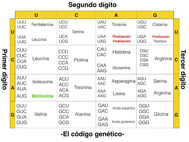 The passage from one language to another is carried out thanks to a code, the genetic code, in which the nucleotide sequence of the mRNA and the amino acid sequence of the proteine are related. The genetic code determines which amino acid corresponds to three nucleotides of mRNA.