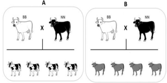 e) Could the white cow in scheme B come from two gray parents? And what about a gray parent and a black parent? Reason the answers with the corresponding cross.