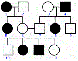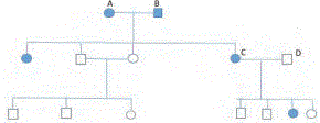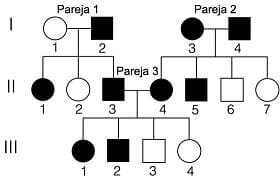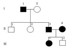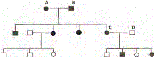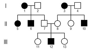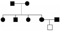 The accompanying genealogy shows the transmission of a monogenic and autosomal disease in a family. Affected individuals are shown in black and healthy individuals in white (men are represented by a square and women by a circle).