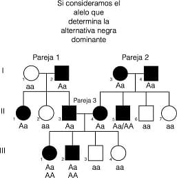 a) Indicate whether the allele that determines the alternative represented in black is dominant or recessive. Reason for the answer using the possible genotypes of all the individuals.