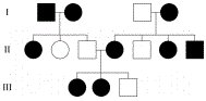 The figure indicates the transmission of a character in a family (men are represented by a square and women by a circle). The trait has the two alternatives indicated in black and white and is determined by a single gene.