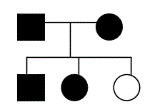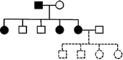 The following family tree shows the inheritance of a disease caused by a single gene mutation. A couple, their progeny, and the mating of one of the daughters are shown. The black symbols represent individuals with the disease. The dotted individuals are the possible grandchildren in this family.
