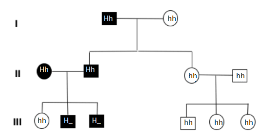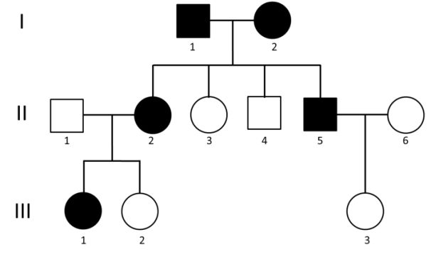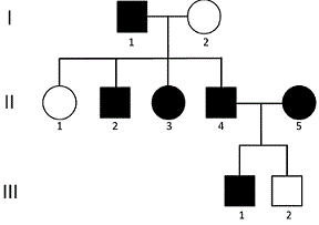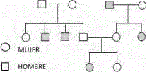 Huntington's disease is a degenerative disease of the nervous system. Its main characteristic is the appearance of motor disorders. In addition, it is accompanied by an intellectual deterioration that, in many cases, leads to emotional and behavioral alterations. A genealogy of Huntington's disease or chorea is shown in the figure below. Women are represented by a circle and men by a square. Individuals in black indicate manifestation of the disease.